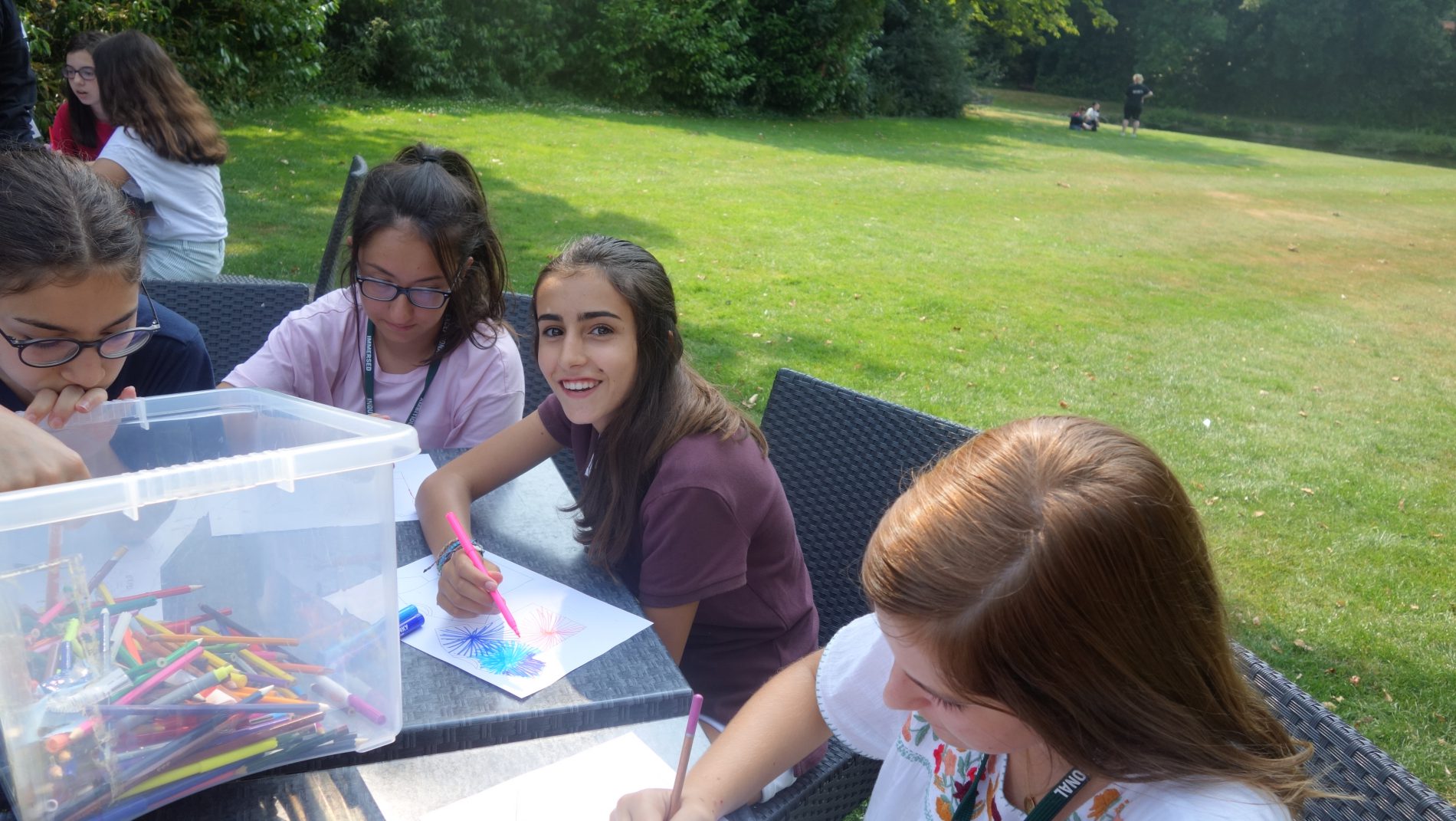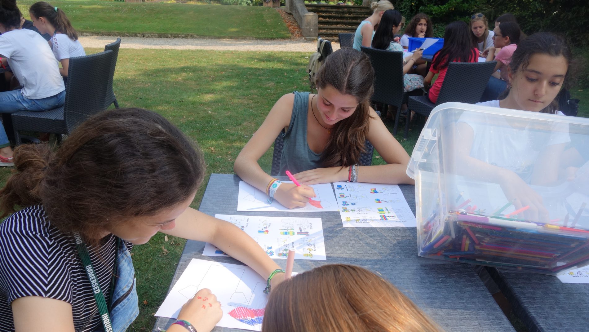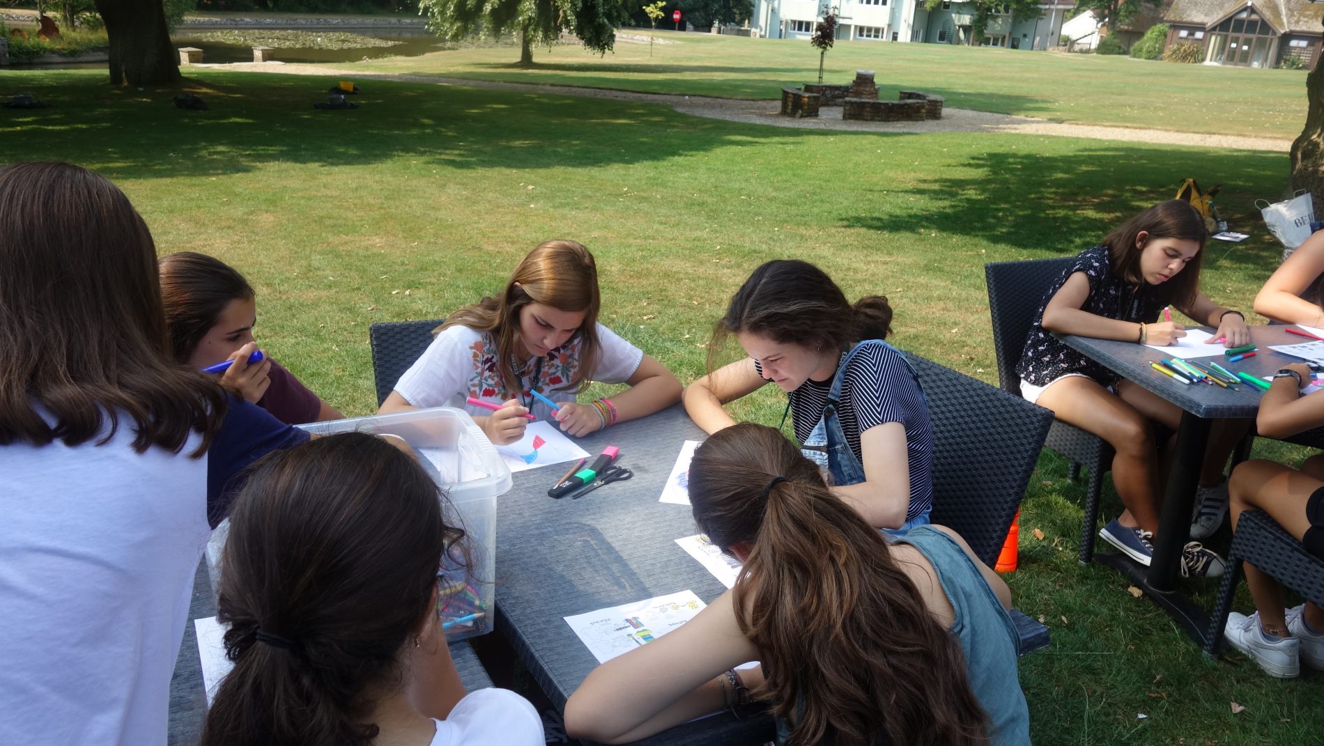 Por la tarde, un abanico de actividades y deportes nos tuvieron entretenidos. Mónica se centró en tenis mientras Lucía, Berta y Lola optaron por el taller de manualidades donde diseñaron sus propias camisetas. Un lujo poder trabajar en un rincón de éste maravilloso campus, entre árboles y con la compañía de las ardillas.