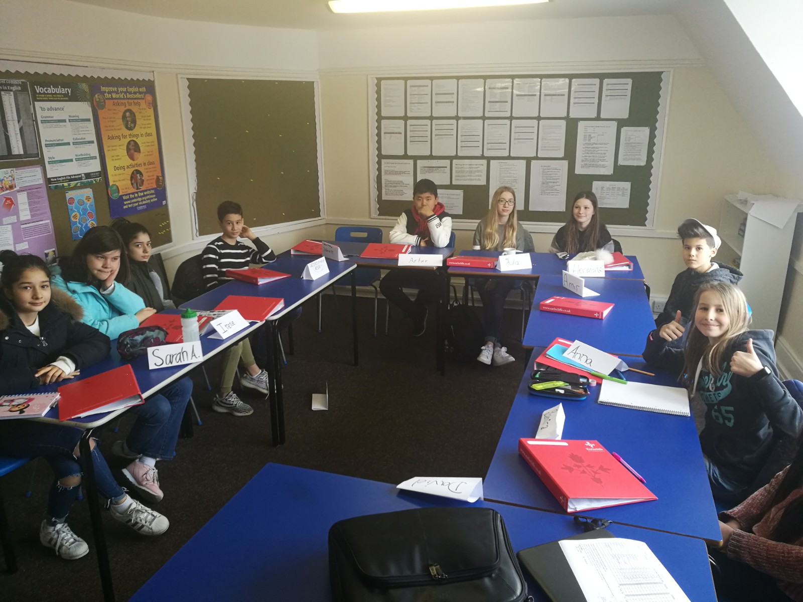 Tras un copioso desayuno, asamblea con la Manager del centro, re distribución en clases por niveles según los progresos de la semana anterior, y estuches y carpetas en posición de aprender mucho.